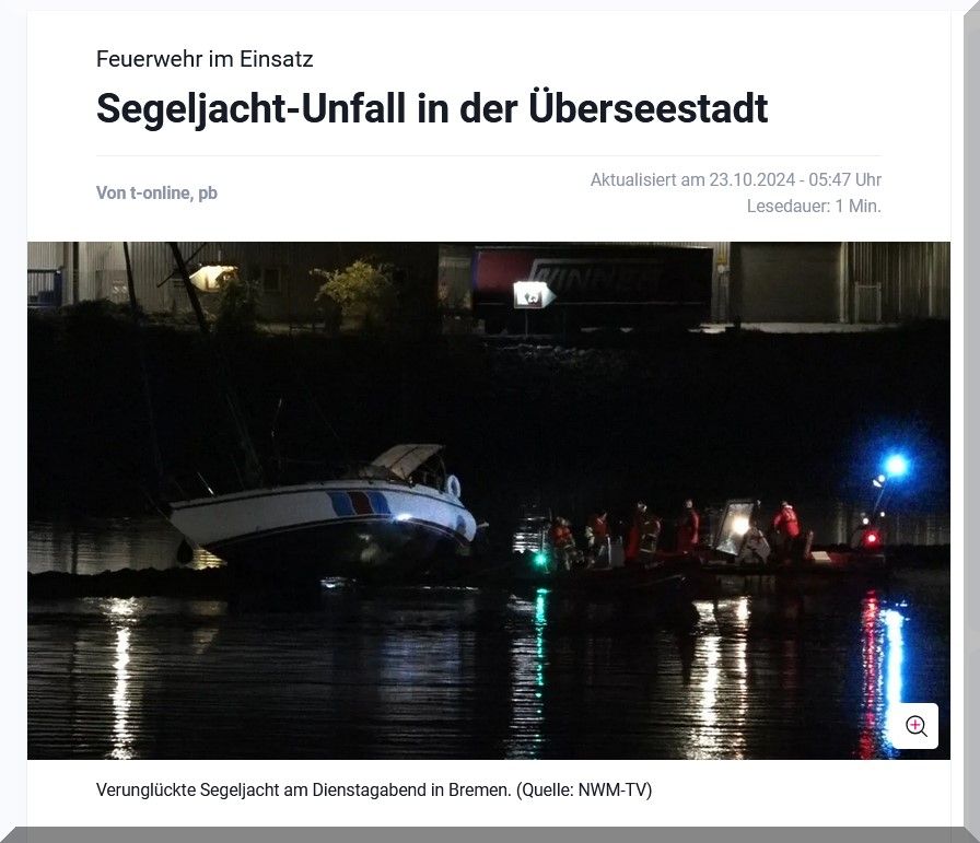 Einsatzkräfte der Feuerwehr und DLRG waren mit zwei Booten schnell vor Ort. Wasser sei trotz der Kollision in die Segeljacht nicht eingetreten, hieß es am Abend. Eine unmittelbare Bergung des Segelboots war aufgrund des weiter fallenden Wasserstands zunächst nicht möglich.