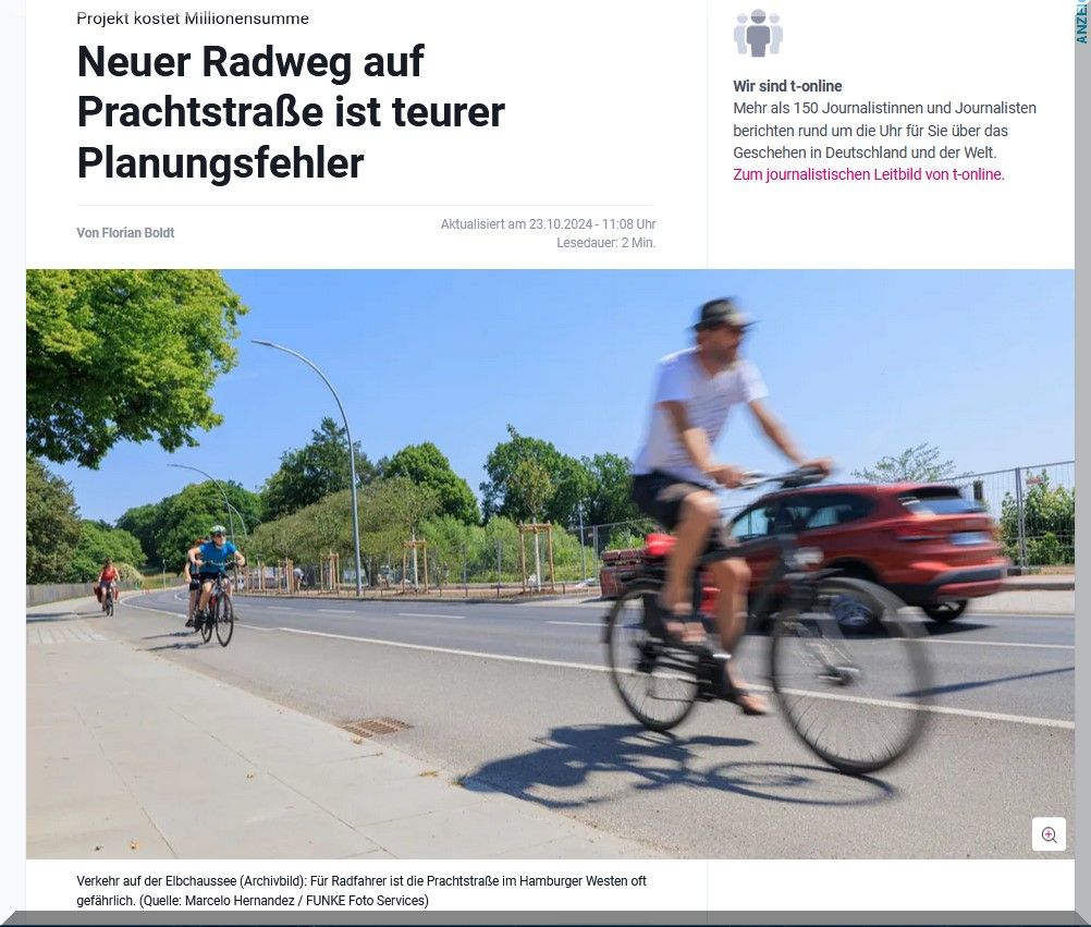 Seit 2021 laufen Sanierungsarbeiten, damit die Elbchaussee auch in Zukunft verkehrstauglich ist und sicherer wird. 30 Millionen Euro hat Hamburg in das Projekt investiert. Der erste Abschnitt zwischen der Manteuffelstraße und der Parkstraße ist bereits seit Dezember 2023 fertig – theoretisch. Denn der Teil zwischen dem Friedhof Nienstedten und der Manteuffelstraße bereitet nach nur wenigen Monaten schon wieder Ärger: Der gerade erst neu eingerichtete Radweg ist zu unsicher und muss weg.