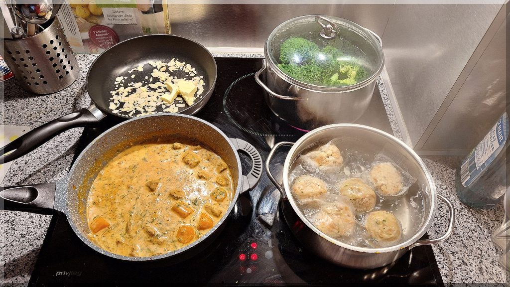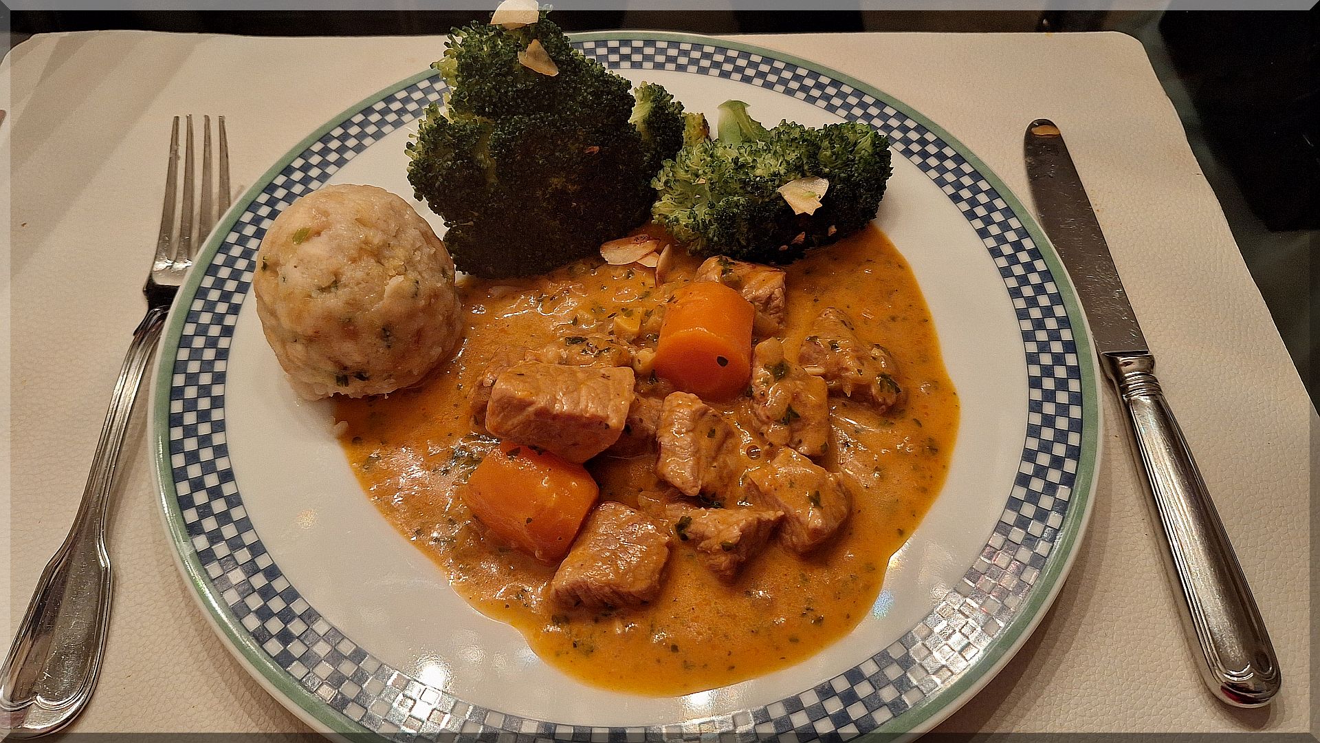 17:30 Uhr – Zum Abendeessen gab es Kalbfleisch Gulasch mit Mandel-Broccoli und Semmelklößen: