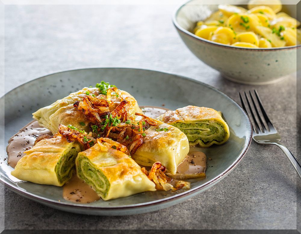 # Maultaschen, geschmälzte Zwiebeln, Kartoffel- u. Gurkensalat (heute Abend)
