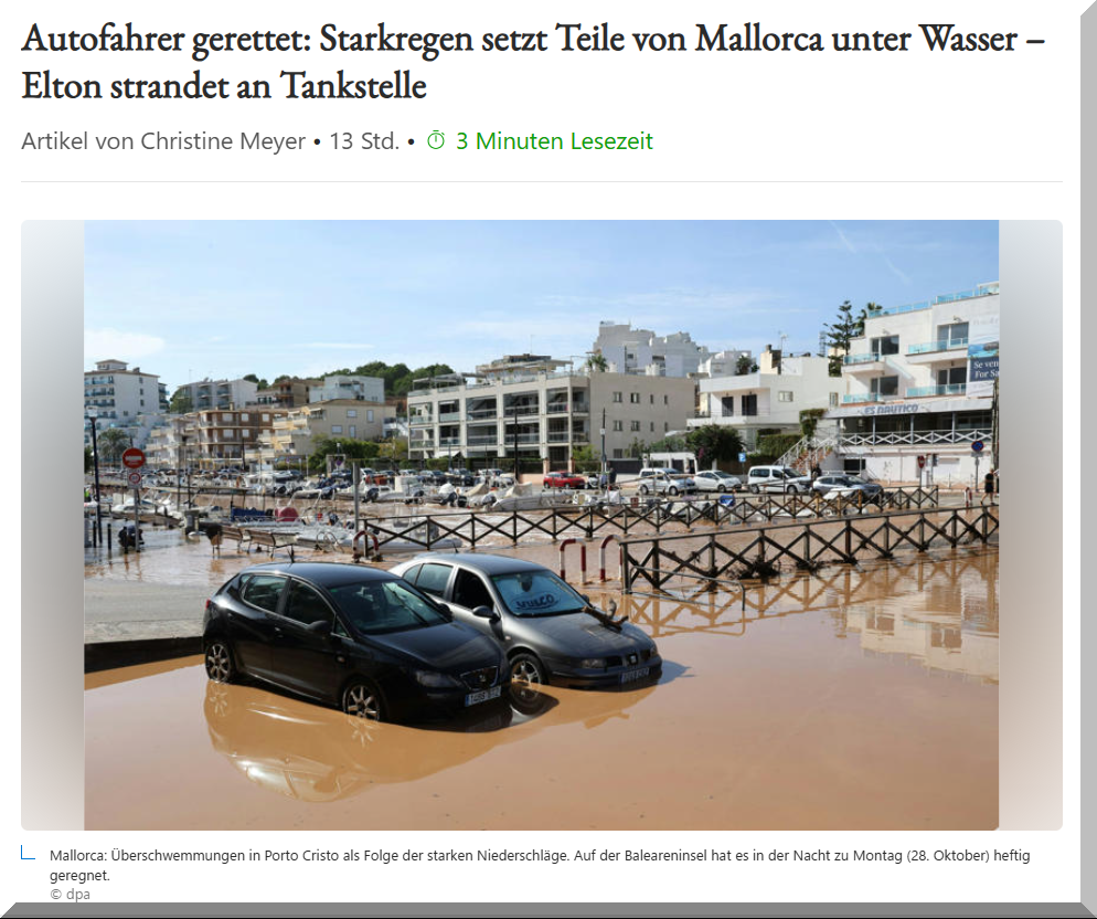 In der Nacht zu Montag (28. Oktober) wurde insbesondere der Südosten Mallorcas heftig erwischt. Im Inselinnern startete die neue Woche laut „Mallorca Zeitung“ sehr nass. An einer Messstation in Manacor wurden 170 Liter pro Quadratmeter gemessen – so viel wie noch nie. Auch Portocolom an der Ostküste war von Starkregen betroffen ebenso wie die Inselhauptstadt Palma, wo es aber nicht ganz so stark regnete. Expand article logo
