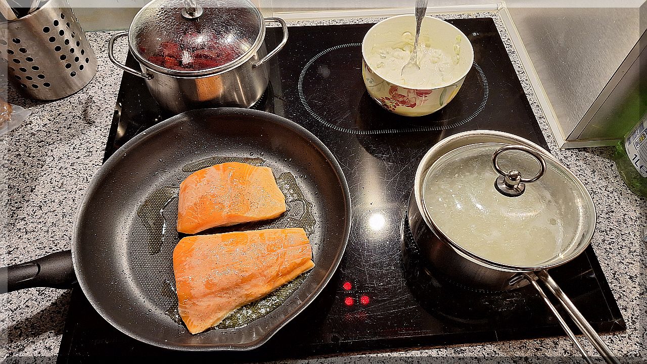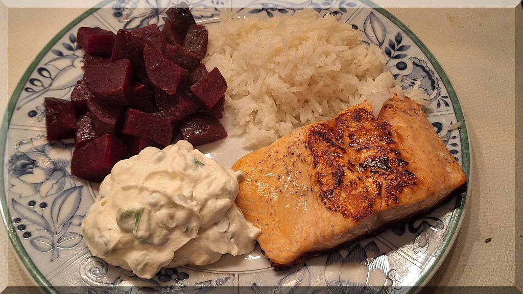 Lachsschnitte auf Hautseite 5 Minuten braten, dann umdrehen u. bei reduzierter Hitze nochmals 3 Minuten fertig braten, Rote Beete mit 30 g Butter u. 3 EL Balsamico / Frischkäse-Dipp mit saurer Sahne und etwas Sahne + Frühlingszwiebel, Salz u. Pfeffer, Zitrone