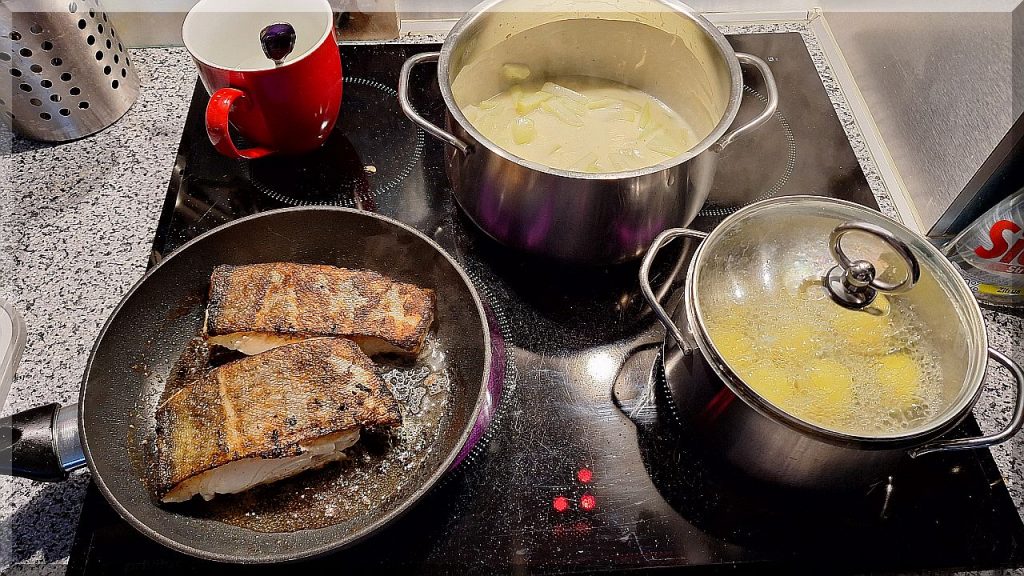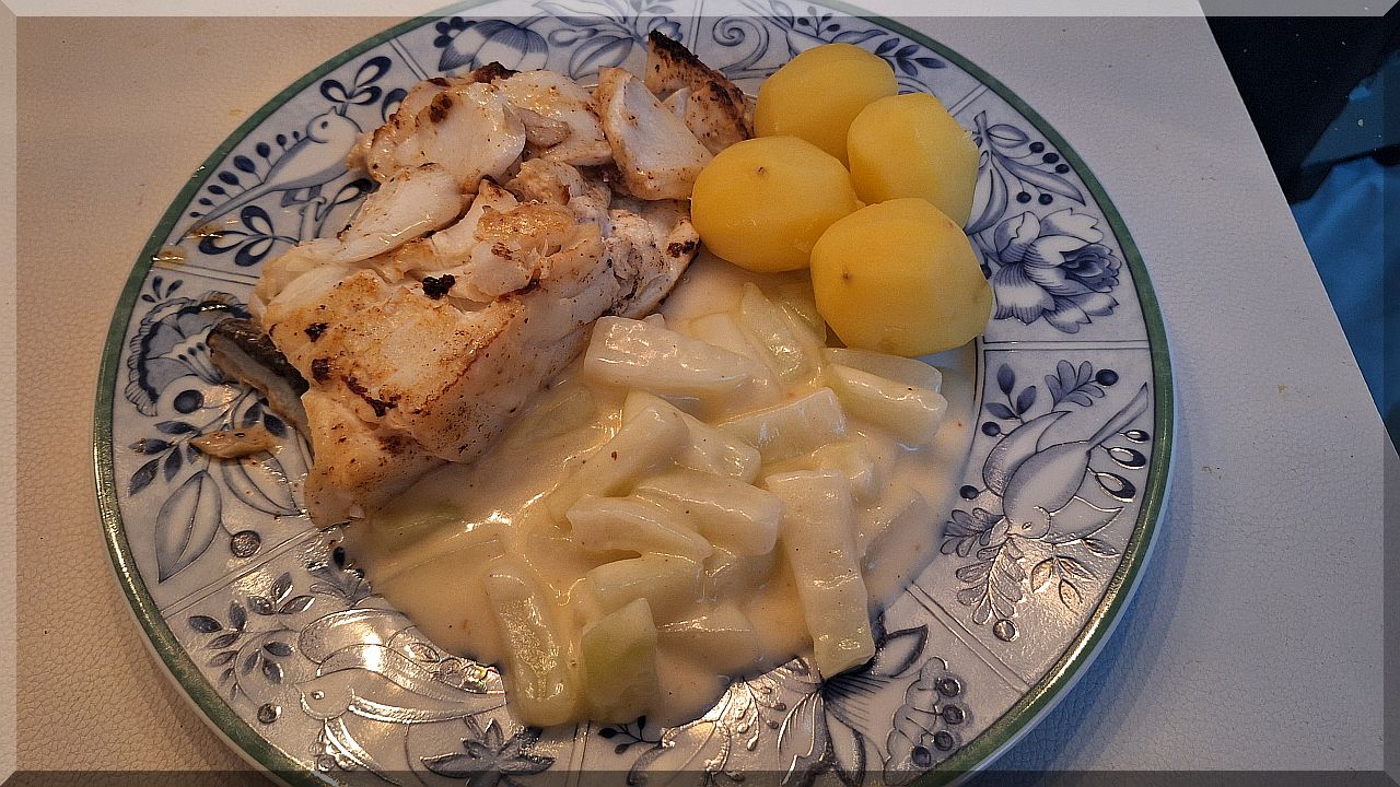 Abendessen: Skrei-Winterkabeljau (2 à ca. 300 g) mit 2 Kohlrabi in Zitronen-Bechamel-Sauce (Saft 1/2 Zitrone) und Salzkartoffeln: