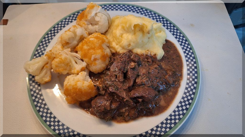 Abendessen: Hühnerleber mit Blumenkohl polnische Art, Kartoffelpüree: