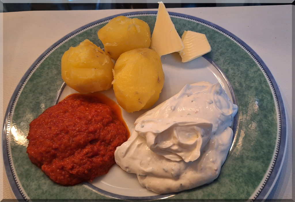 Abendessen: Quark mit Schnittlauch, Pellkartoffeln, für mich noch Ajvar u. Butter