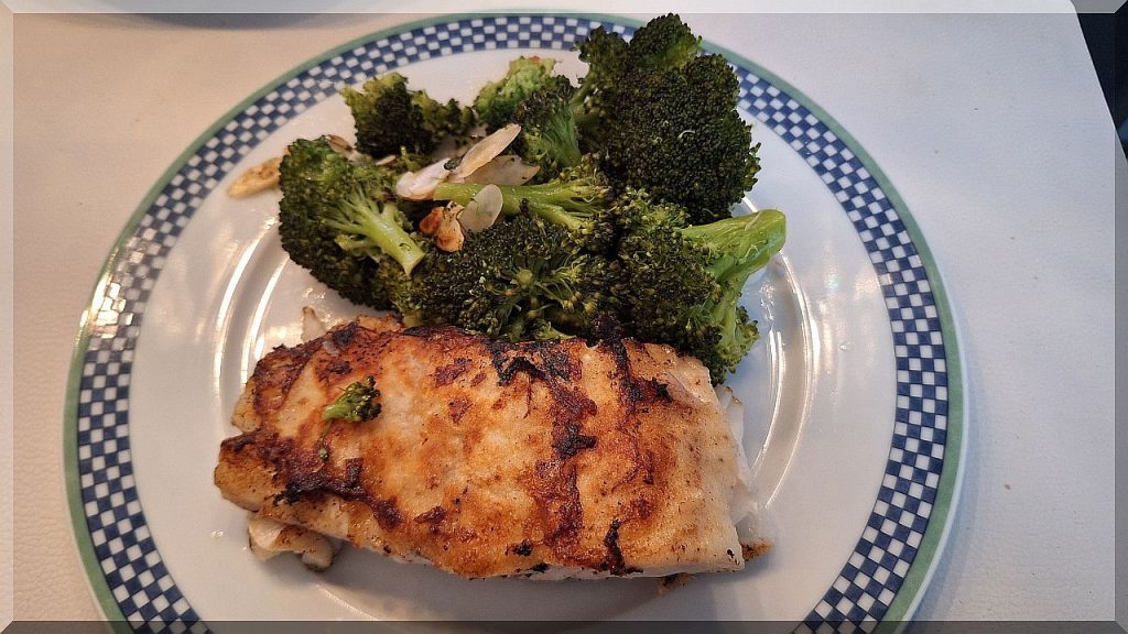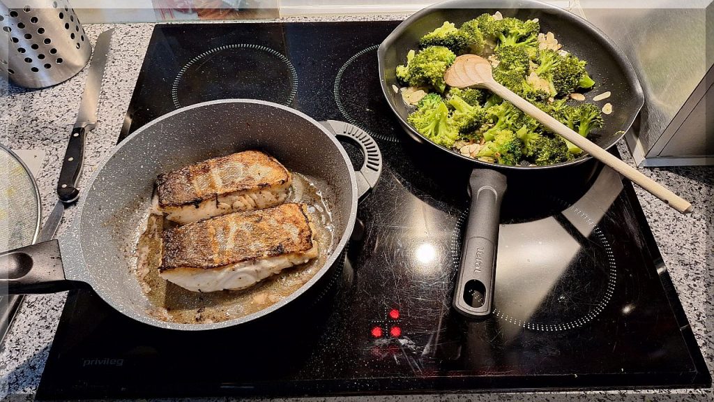 Zum Abendessen gab es natürlich Skreifilet mit Butter-Mandel-Boccoli: