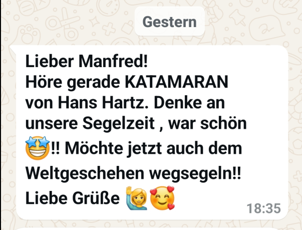 Musik höre ich ja zur Genüge, nur kann sie die dunklen Gedanken nicht mehr besiegen und zum Wegsegeln ist es für mich bereits zu spät. Trotzdem ein schöner Gedanke, wenn man vor den Unbillen des Lebens einfach davonsegeln könnte.