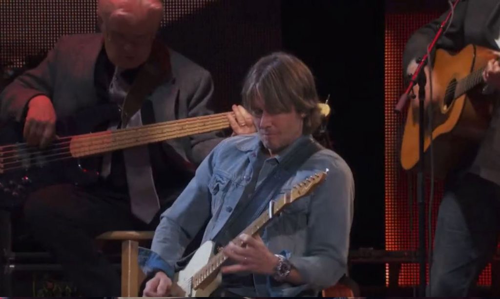 ….. und noch zwei Titel I Ain’t Living Long Like This u. Tumbling Dice mit Vince Gill (USA), Albert Lee (GB – in dem dezent bunten Hemd und der Silberlocke) und Keith Urban (AUS),