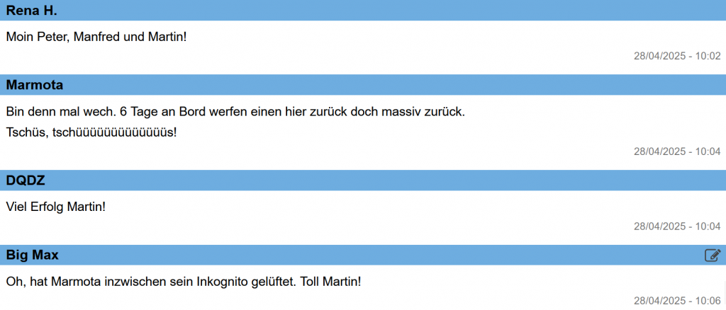 Keine einzige Rückmeldungen von Seefunkstellen, noch nicht einmal Radio-Checks. Als man wohl die Windwarnungen vernommen hat, hat man sich gleich wieder die Bettdecke über den Kopf gezogen.