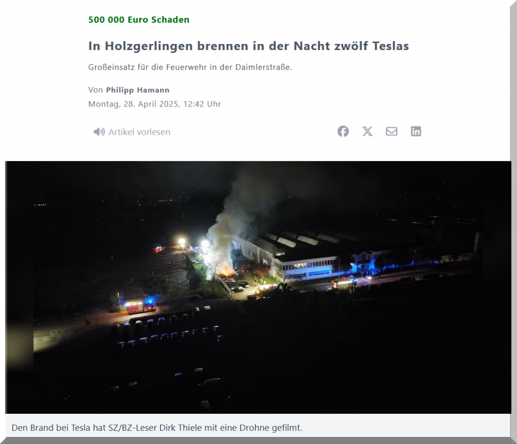 Holzgerlingen. Am Montagmorgen gegen 1.45 Uhr meldete ein Anwohner ein Feuer im Außenbereich des Tesla Automobilauslieferungszentrums in der Daimlerstraße in Holzgerlingen. Nachdem Polizei und Feuerwehr eingetroffen waren, wurde festgestellt, dass mehrere nebeneinander geparkte Teslas auf dem Hof des Automobilherstellers aus bislang ungeklärter Ursache in Brand gerieten und hierbei erheblich beschädigt wurden.