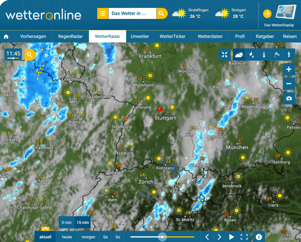 Erwartete Höchstemperatur des Tages in Sindelfingen: 28 °C.