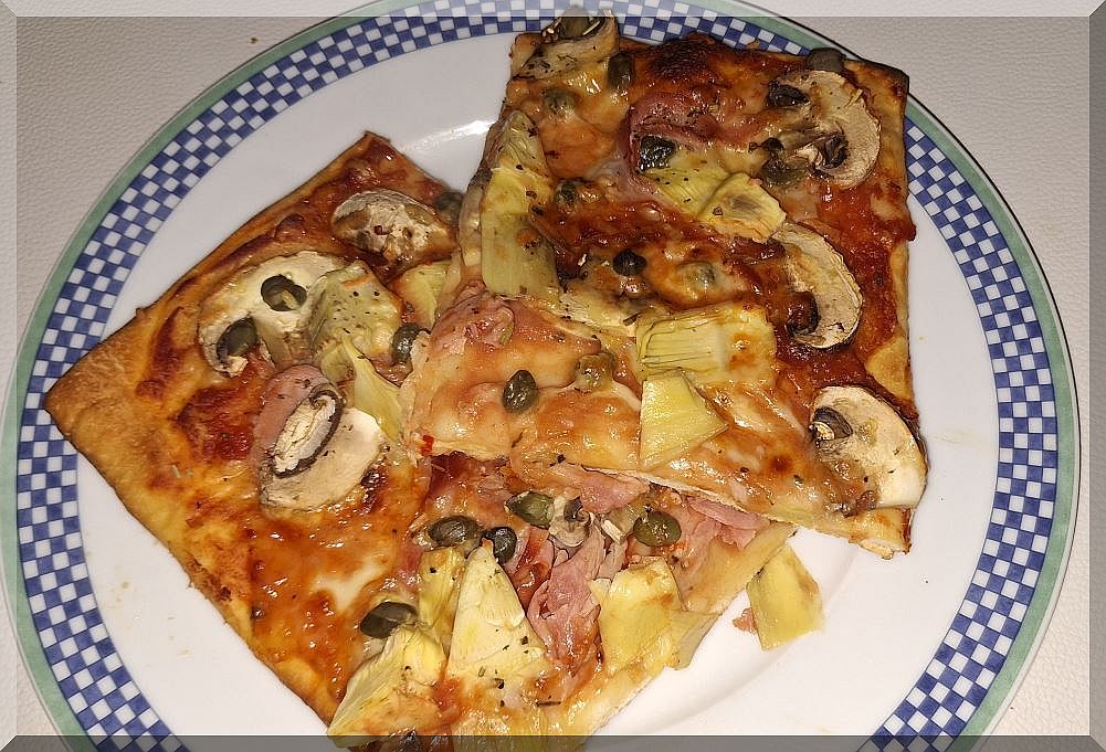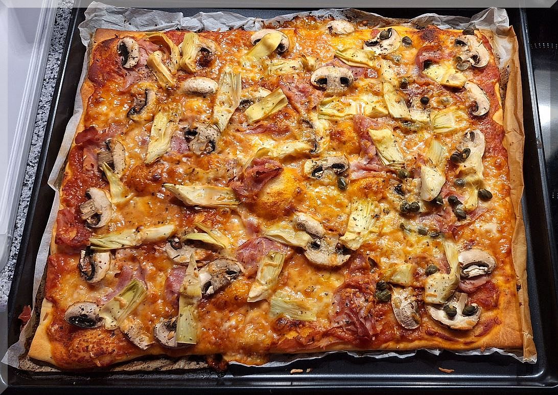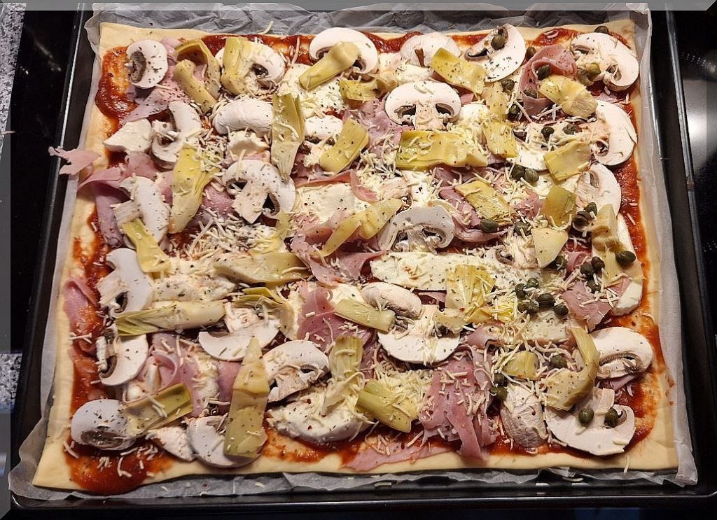 17:30 Uhr – Marianne belegte uns eine Pizza Capricciosa: Auf den Teig kamen Tomatensoße, Mozzarella, gek. Schinken, Champignons, Artischocken, geriebener Käse: