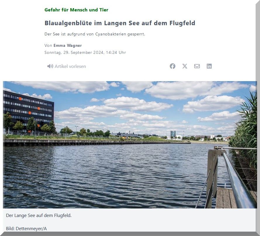 Sindelfingen/Böblingen. Aufgrund einer verstärkten Blaualgenblüte (Cyanobakterien) im Langen See auf dem Flugfeld Böblingen/Sindelfingen wird der See ab sofort bis auf Weiteres gesperrt. Diese Maßnahme dient dem Schutz von Mensch und Tier, da die Blaualgen in bestimmten Fällen toxische Stoffe produzieren können, die insbesondere für am See spielende Kinder oder Tiere (z.B. Hunde, die aus dem See trinken) gefährlich sein können.