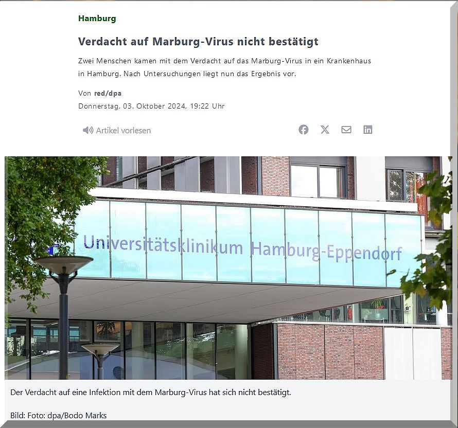 Der Verdacht auf das Marburg-Virus bei zwei Menschen in Hamburg hat sich nicht bestätigt. Die Tests seien negativ ausgefallen, teilte die Sozialbehörde mit. Eine der beiden Personen hatte kurz zuvor in Ruanda in einem Krankenhaus gearbeitet, wo auch mit dem Virus infizierte Menschen behandelt wurden.