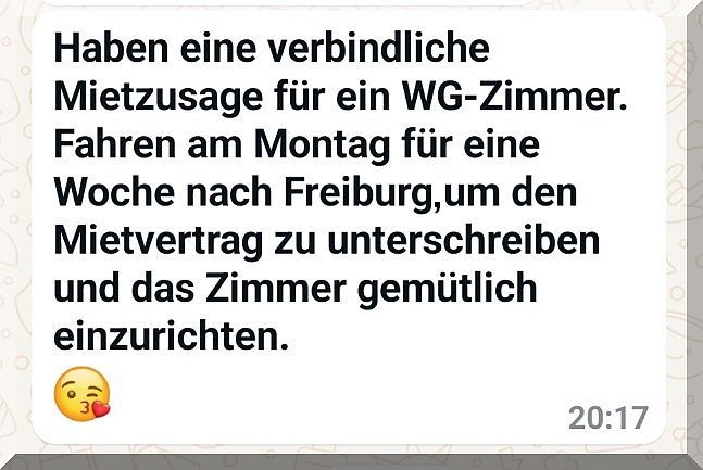 Frohe Nachricht! Meine Enkelin Lea hat endlich ein Zimmer in Freiburg gefunden.