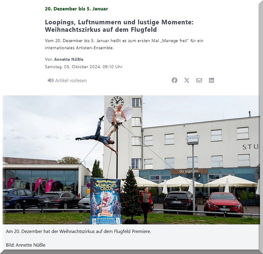 Böblingen/Sindelfingen. Erstmals gastiert über die Weihnachtsfeiertage ein Zirkus auf dem Flugfeld. Einen kleinen Vorgeschmack bekamen Besucher dieser Tage vor der Motorworld, als Artistin Lisa Rinne und Artist Andreas Bartl eine kleine Akrobatiknummer zeigten. „Wir wollten ein Motiv, das auf dem Flugfeld entstanden ist“, sagt Tourneeleiter Harald Ortlepp zur Begründung für Tannenbaum, Roll-Up und die als Engel verkleidete Artistin Lisa Rinne.