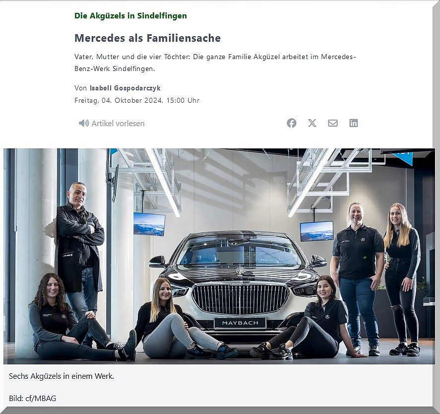 Sindelfingen. „Wenn ich groß bin, fahre ich einen Benz.“ Gürsel Akgüzels jüngste Tochter Evin wusste von klein auf, wohin ihr Weg sie eines Tages führen soll. Ihr Arbeitgeber sollte Mercedes-Benz sein, derselbe wie von ihrem Vater. Heute arbeiten nicht nur sie beide im Werk Sindelfingen, sondern die ganze Familie Akgüzel: Die vier Schwestern Shirin (23), Yelin (22), Dilara (19) und Evin (18), Mutter Jasmin (44) und Vater Gürsel (43).