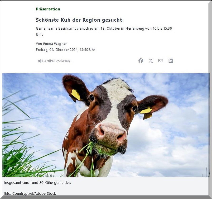 Kreis Böblingen. Die Viehzuchtvereine Böblingen-Herrenberg, Calw-Nagold, Freudenstadt, Ludwigsburg und Tübingen veranstalten erstmalig mit Unterstützung der Rinderunion Baden-Württemberg eine gemeinsame Bezirksrindviehschau. Die Veranstaltung findet am Samstag, 19. Oktober von 10 Uhr bis ca. 15.30 Uhr in der Viehauktionshalle in Herrenberg statt. Ein besonderes Highlight der Veranstaltung bildet um 12 Uhr der Tiervorführwettbewerb, bei dem Kinder einige Kälber präsentieren.