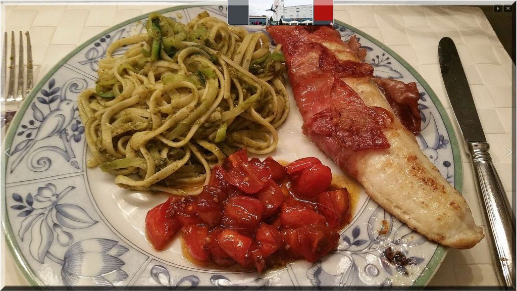 17:30 Uhr – Zum Abendessen gab es Zanderfilet im zarten Baconmantel, halbierte Kirschtomaten in 1 EL Sonnenblumenöl und 2 EL rotem Balsamico 15 Minuten eingekocht und Linguine mit Julienne Zucchini.