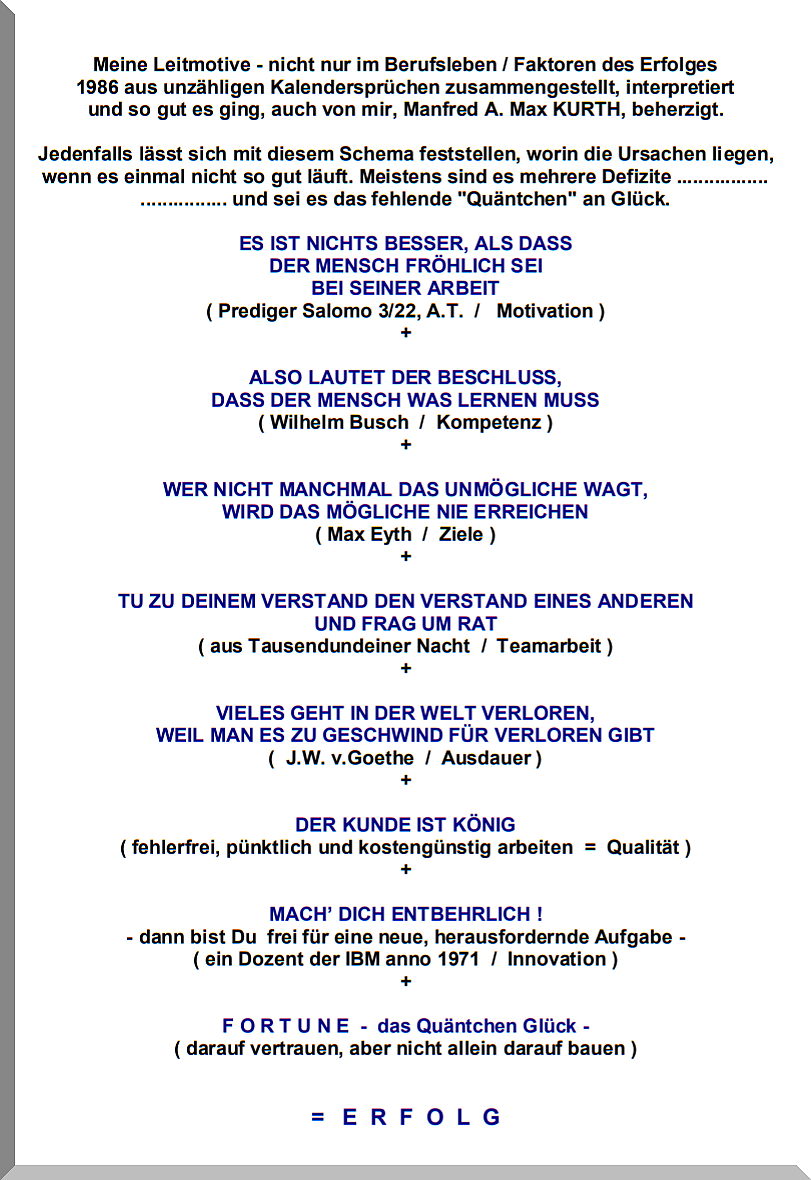 Die nebenstehende Tafel hing rund 10 Jahre gerahmt in meinem Büro. Viele meiner Mitarbeiter und andere Kollegen haben mich gelegentlich gefragt, ob das auch meine ehrlichen Überzeugungen seien? Na klar, habe ich stets geantwortet. Sie dürfen das gerne adaptieren und verbreiten.