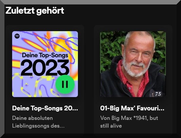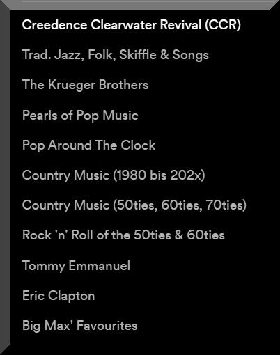 Am 7. Januar 2023 hat mir Alex erneut die Vorzüge von Spotify geschildert, der Schwedische Audio Streaming Service und ich habe erkannt, dass ich damit gut meine „Big Max‘ Favourites“ abbilden kann und zahllose andere Playlists meiner individuellen Gestaltung. Obendrein synchronisieren sich die Playlists dann auf allen smarten Geräten und PCs. Eigentlich logisch, denn ich erledige den Änderungsdienst ja online auf dem Spotify-Server.